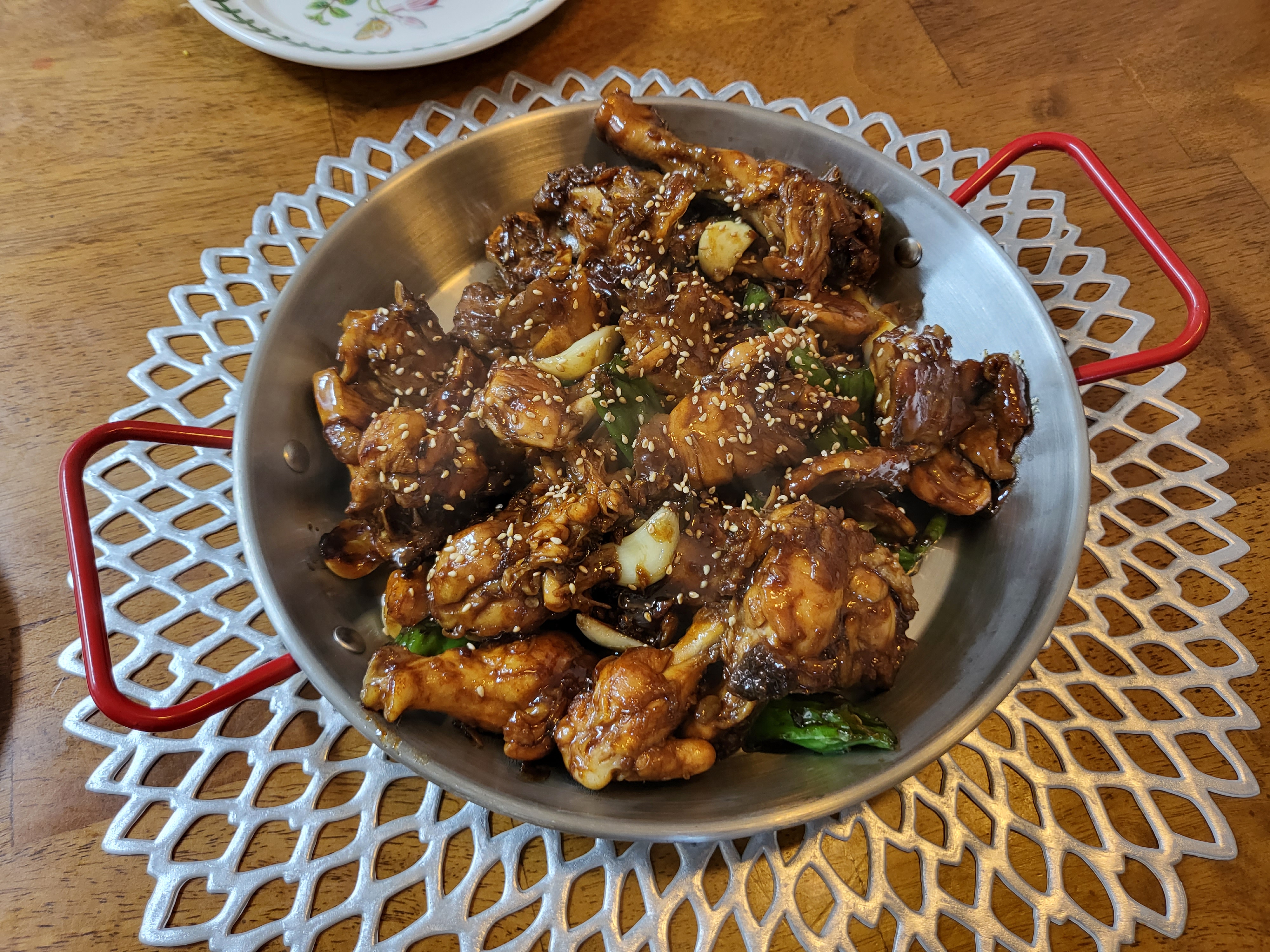 참기름 두른 후 물기빼고 칼집낸 닭 넣고 약불에서 살살 익히다가 비락식혜 넣고 자글자글해지면 짜장가루로 만든 소스넣고 만드는 요리. 유튜브 검색하면 나오는 레시피라 궁금하시면 찾아보시길. 맥주에 참좋은 안주인데 와인에도 좋고 시간이 좀 걸리긴 하지만 그만큼 맛있다. 두번째 만들어먹을 정도로.....