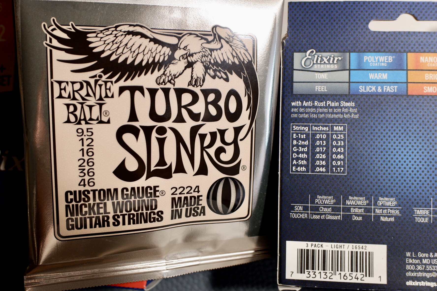 전에 할인행사때 쟁여둔 터보슬링키. 010 세트랑 비교하면 1,2,3번 줄만 한단계 얇은데, 실제 장착하고 보니 확연한 차이는 느껴지지 않는다. 뭔가.... 010 보다 약간 장력 낮추고 싶을때 쓰면 될 것 같고. 저음현도 얇은 Primo 슬링키는 009 보다는 좀 강하게 쓰고 싶을때 쓰면 될 듯.