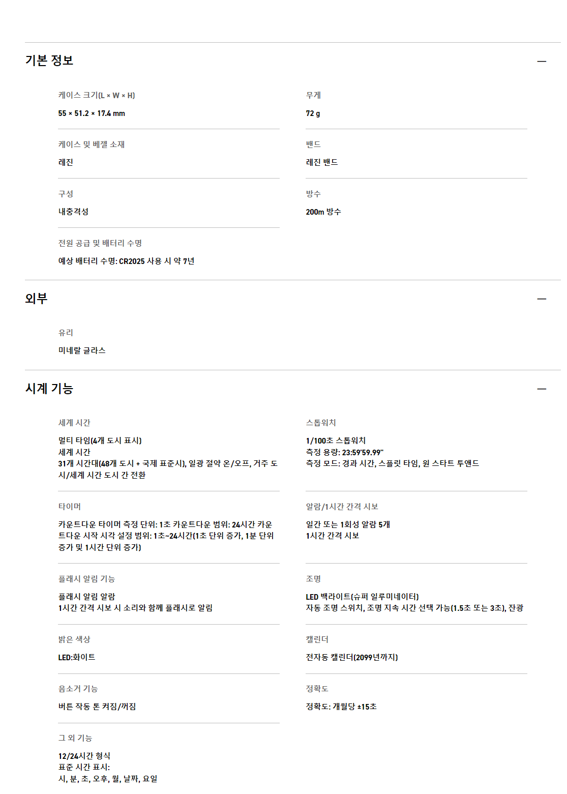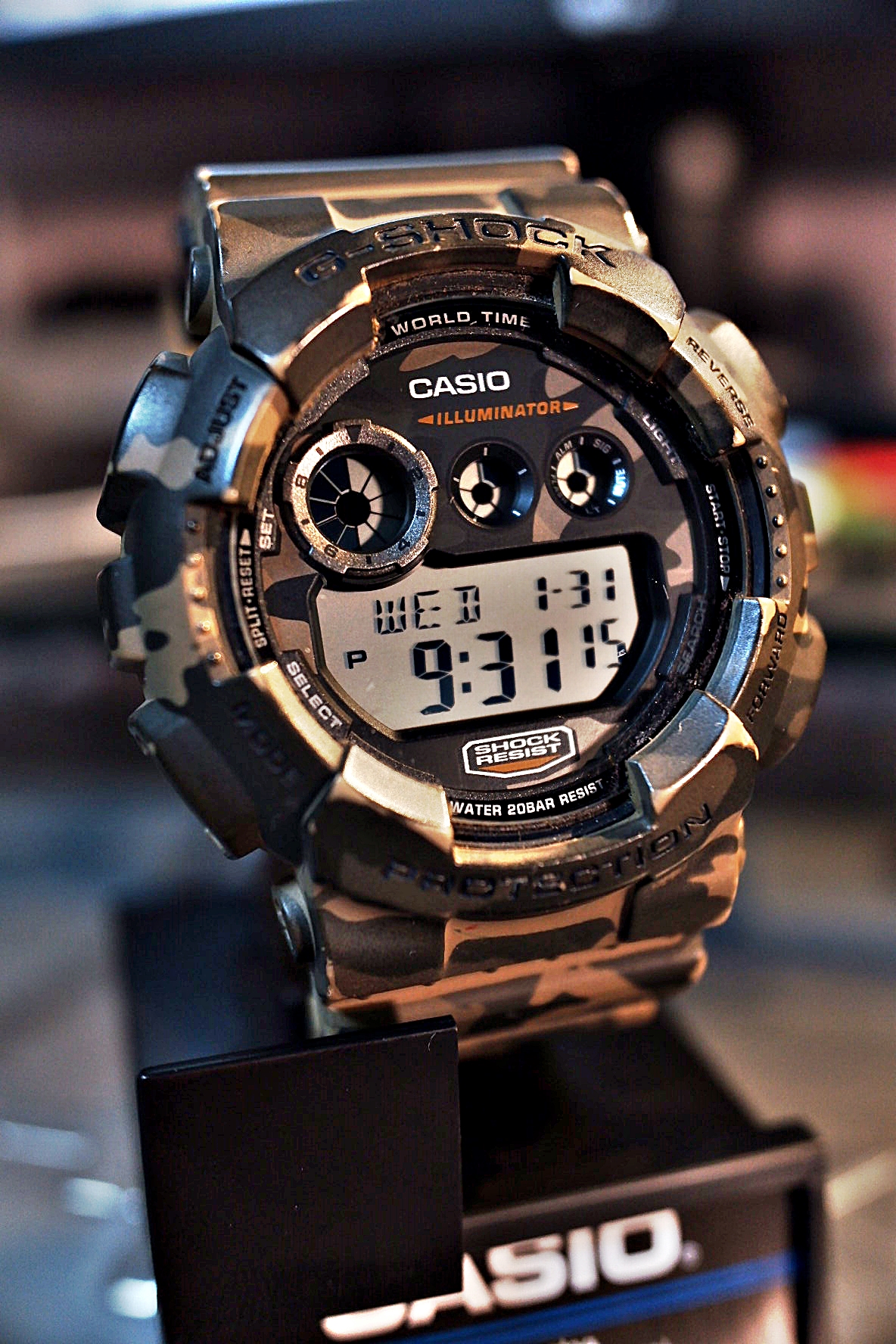 G-Shock Camouflage 시리즈. 머.... 새로울 건 없다. 레진 케이스에 미네랄 글래스. 방수에 멀티타임, 알람, 카운트다운, 백라이트 등등. 아래 사양 참조.