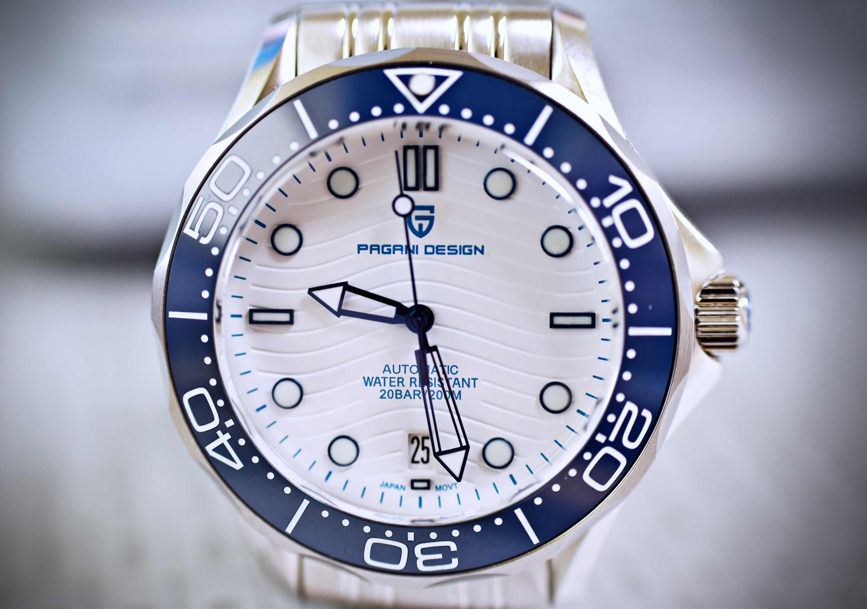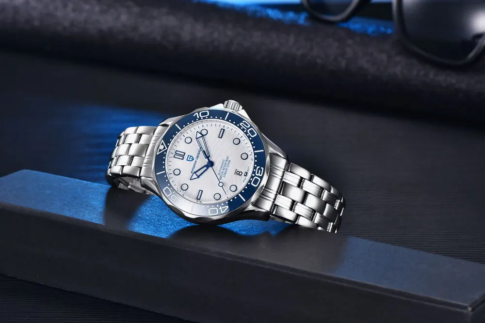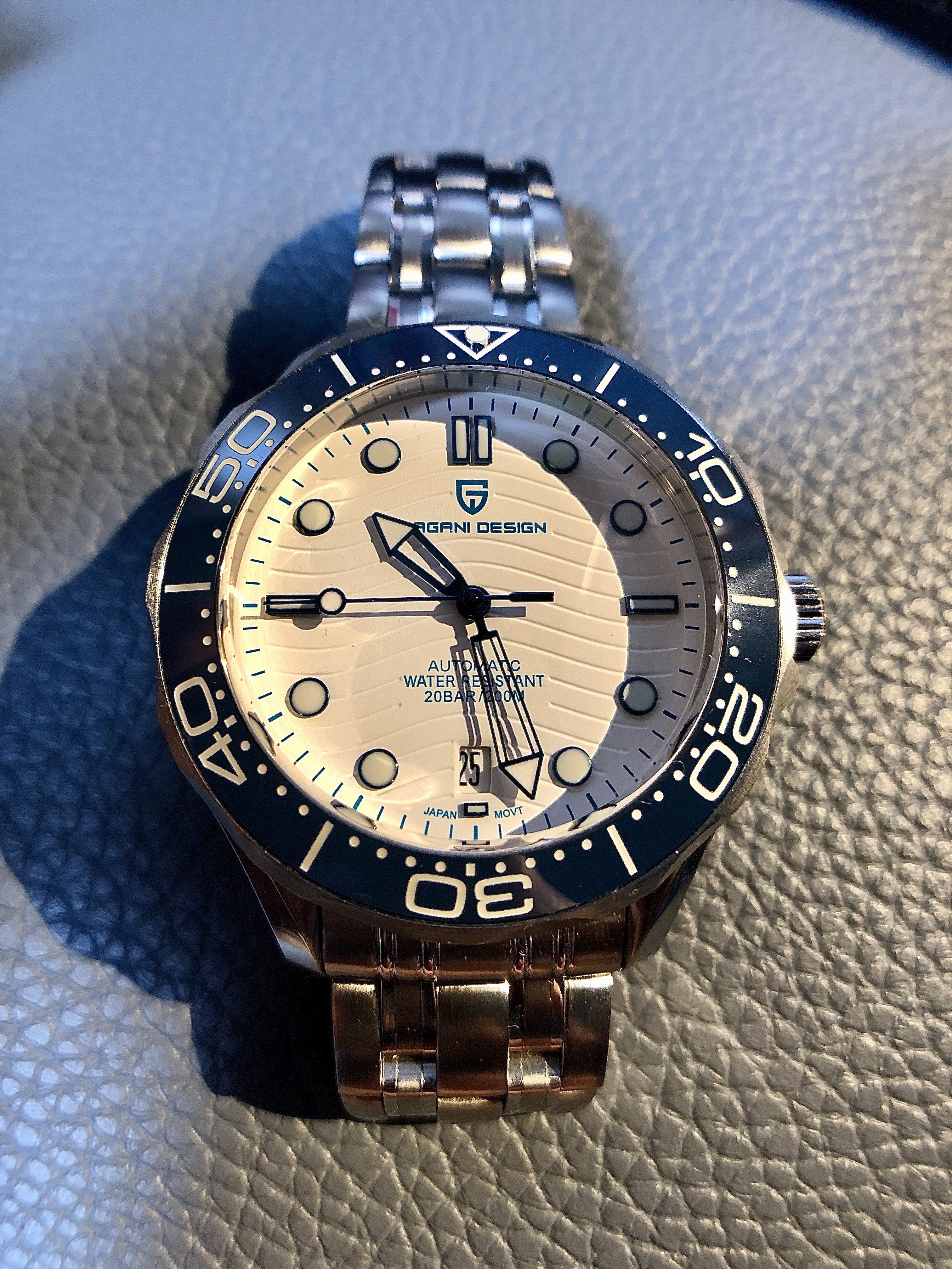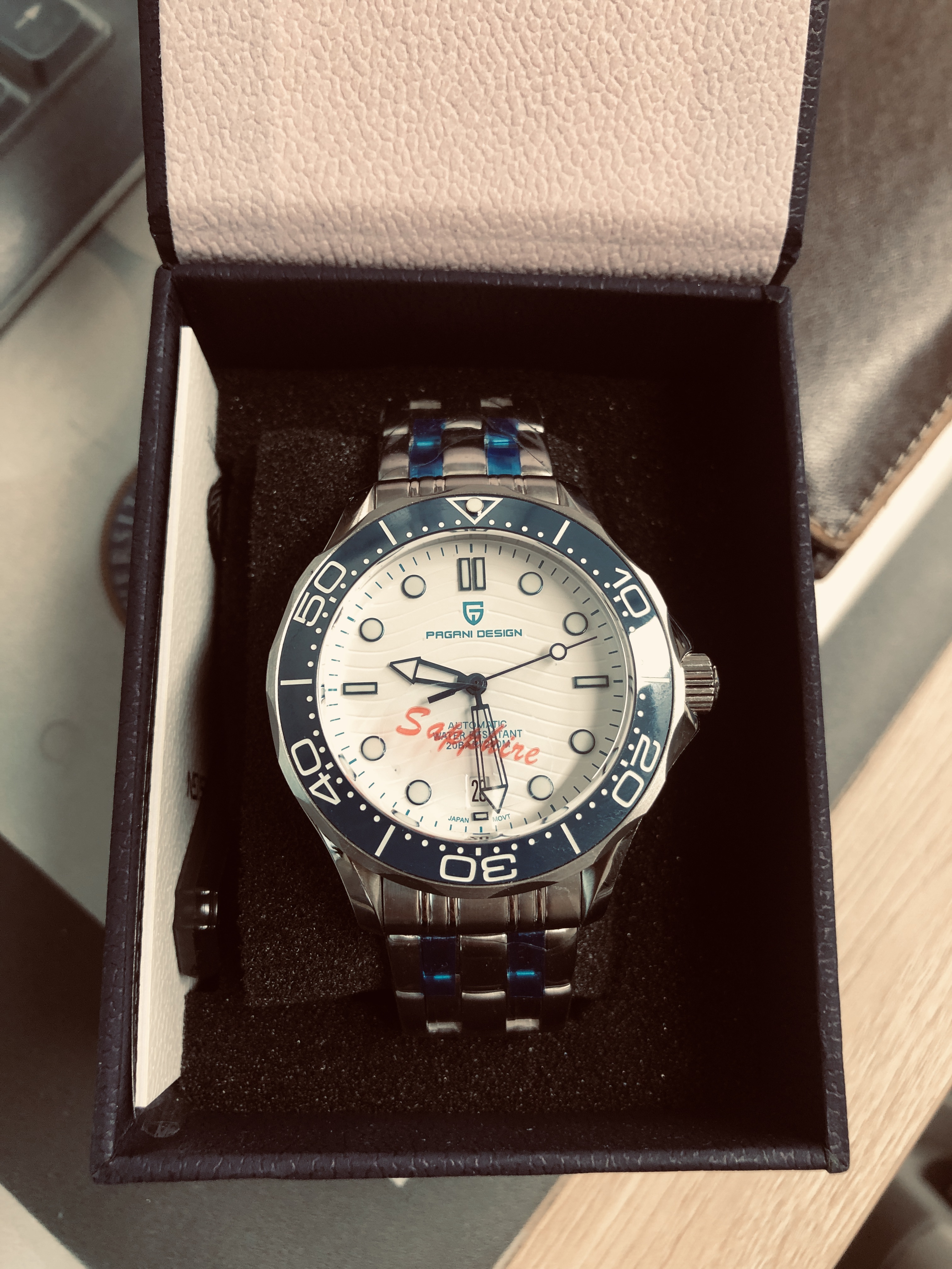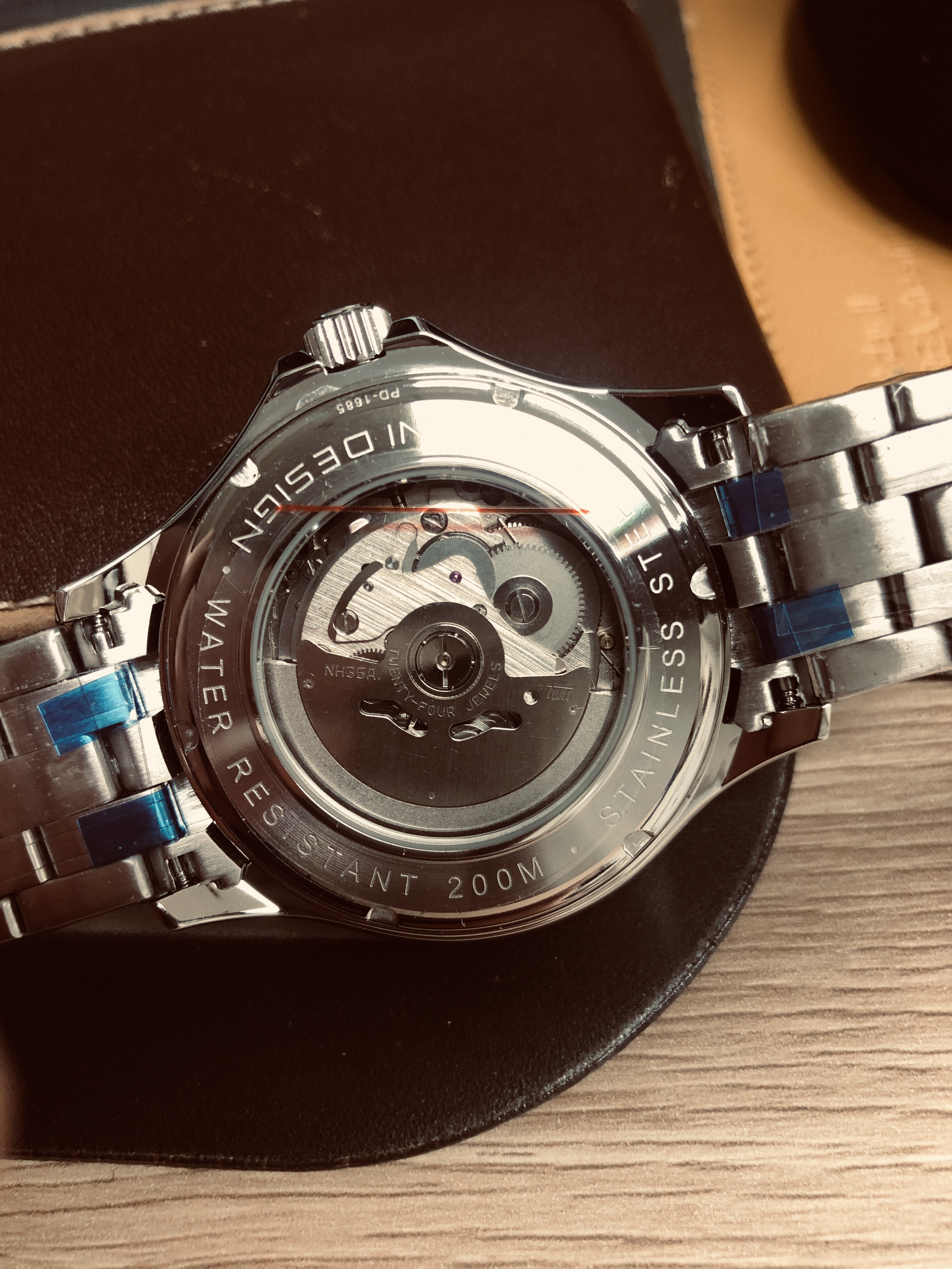 중국산 오토매틱시계인데, 글라스가 무려 사파이어 크리스탈. 평생 기스 걱정은 없을 거 같고, 시계표면도 살짝 무늬가 있는 것이 아주 이쁘다. 베젤은 120클릭의 세라믹. 엉성하게 돌거나 하지 않고, 아주 견고하게 돌아간다. 무브먼트는 일본 NH35. 200미터 방수에 야간형광...... 글쎄다. 이런 가격에 이런 제품을 생산가능하다니......신기할 정도.