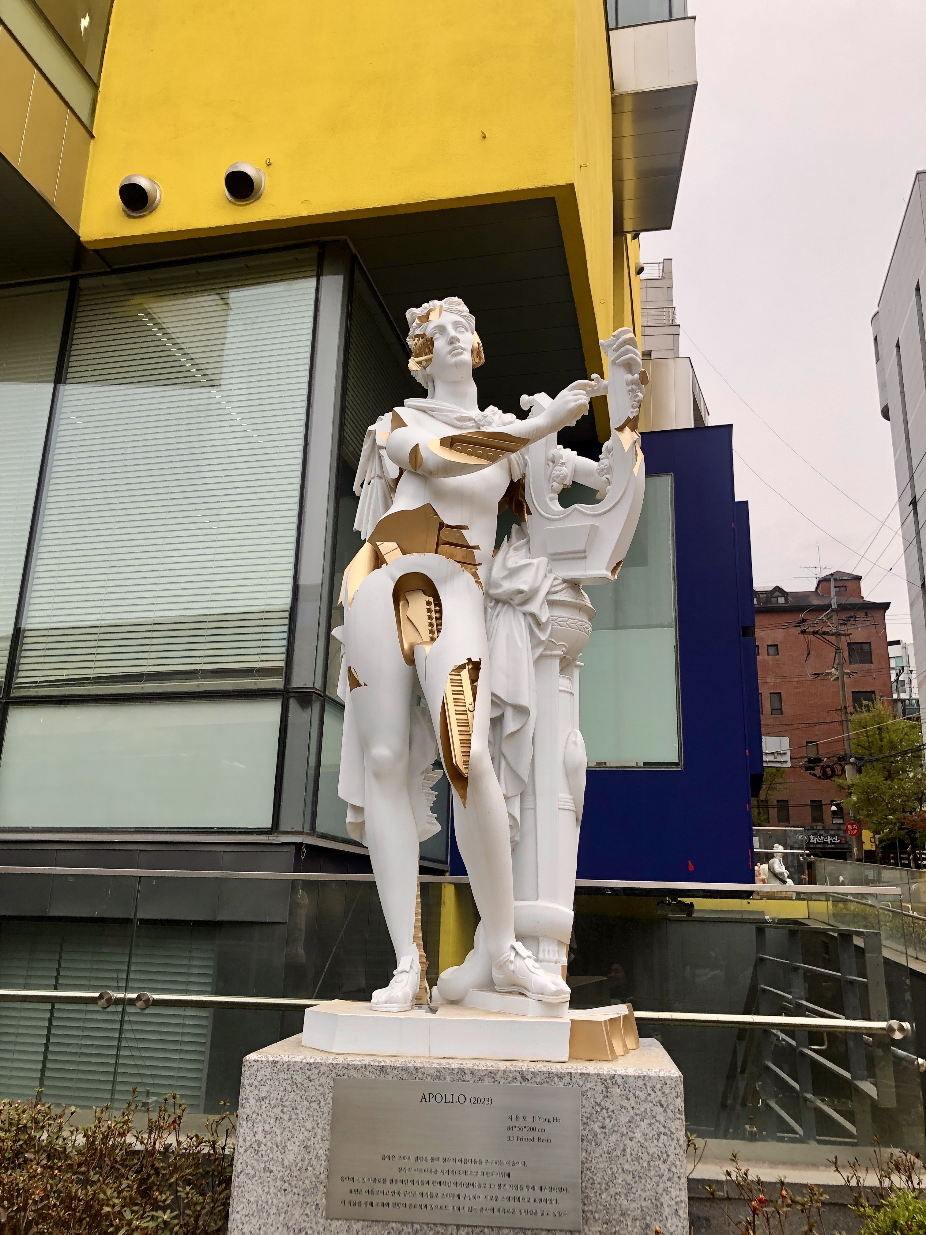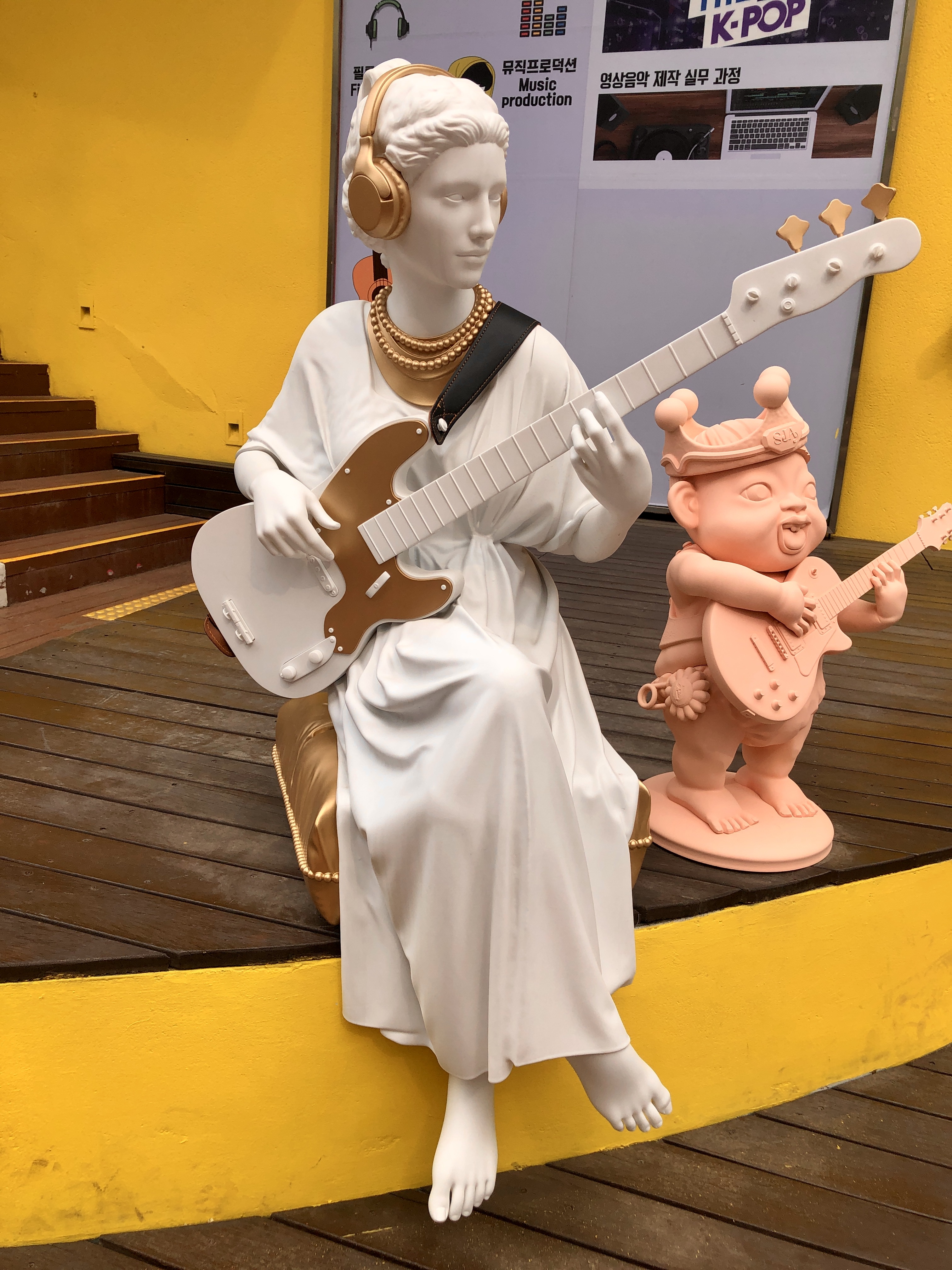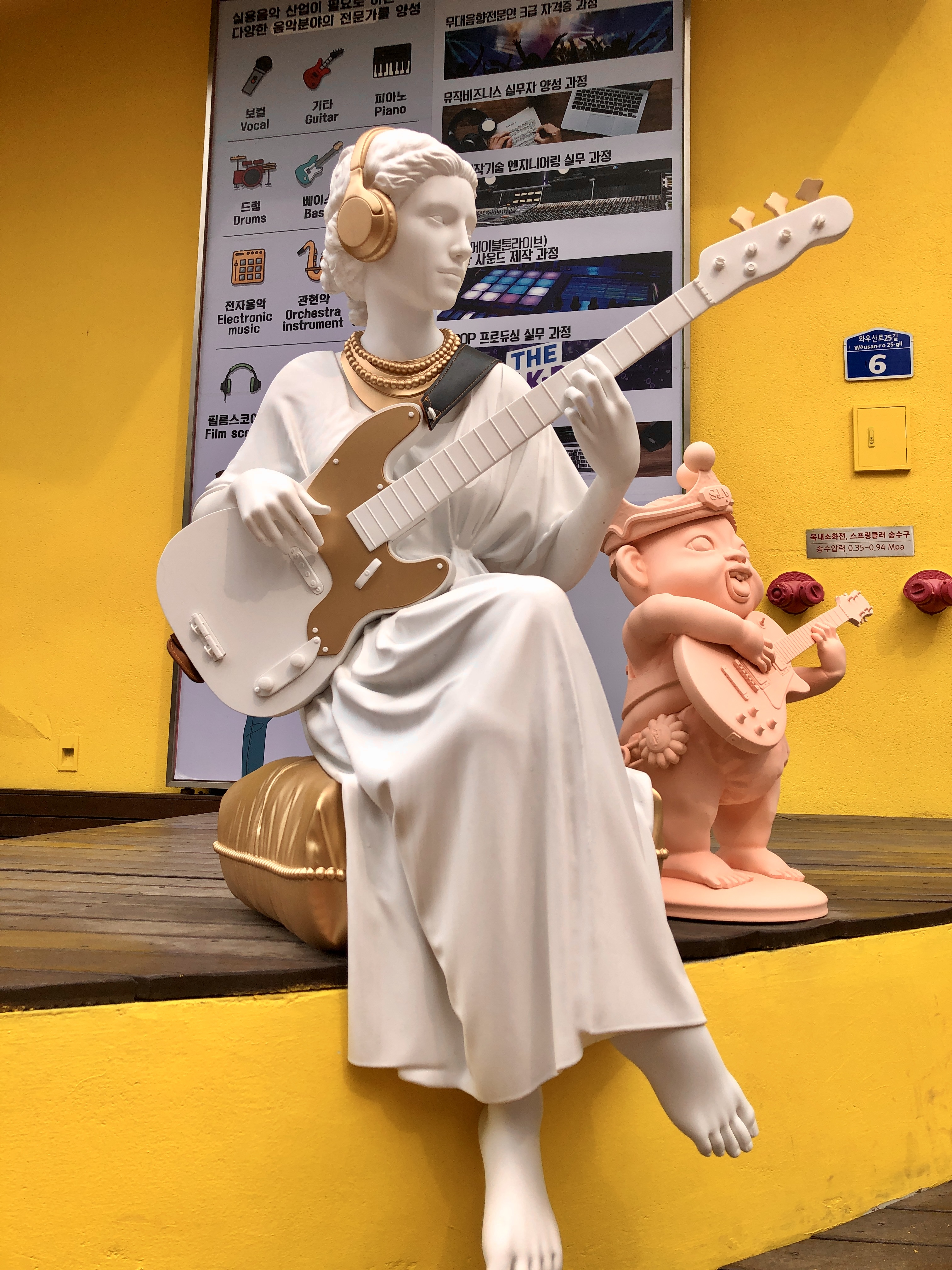 홍대라 그런지 여기저기 미술학원이 많아 입구에 아래와 같은 멋진 조각상들이^^. 기타도 제대로 표현했네....ㅋ. 근데, 베이스 기타는 줄감개가 왜 3개냐.....누가 하나 뜯어간듯.