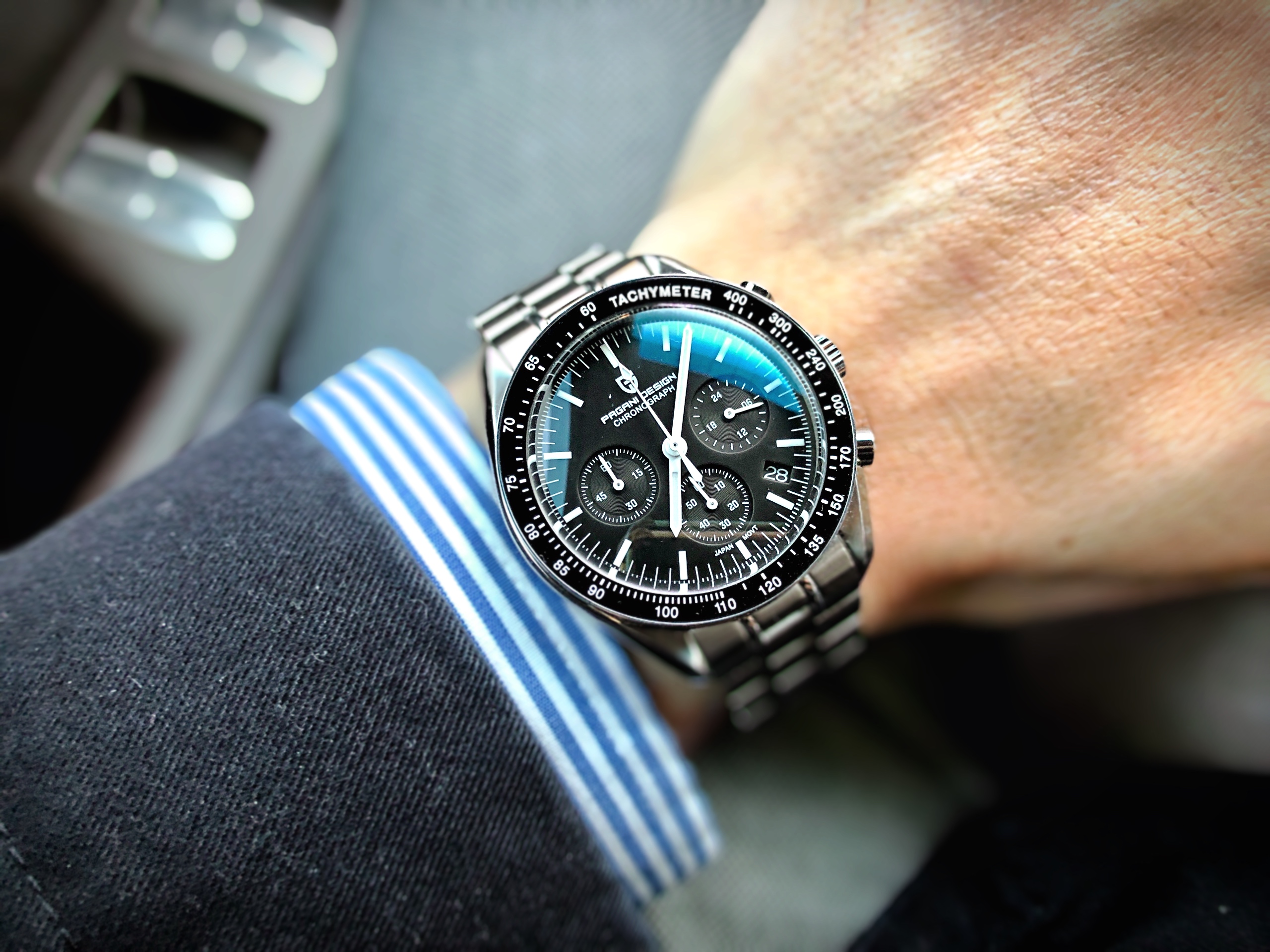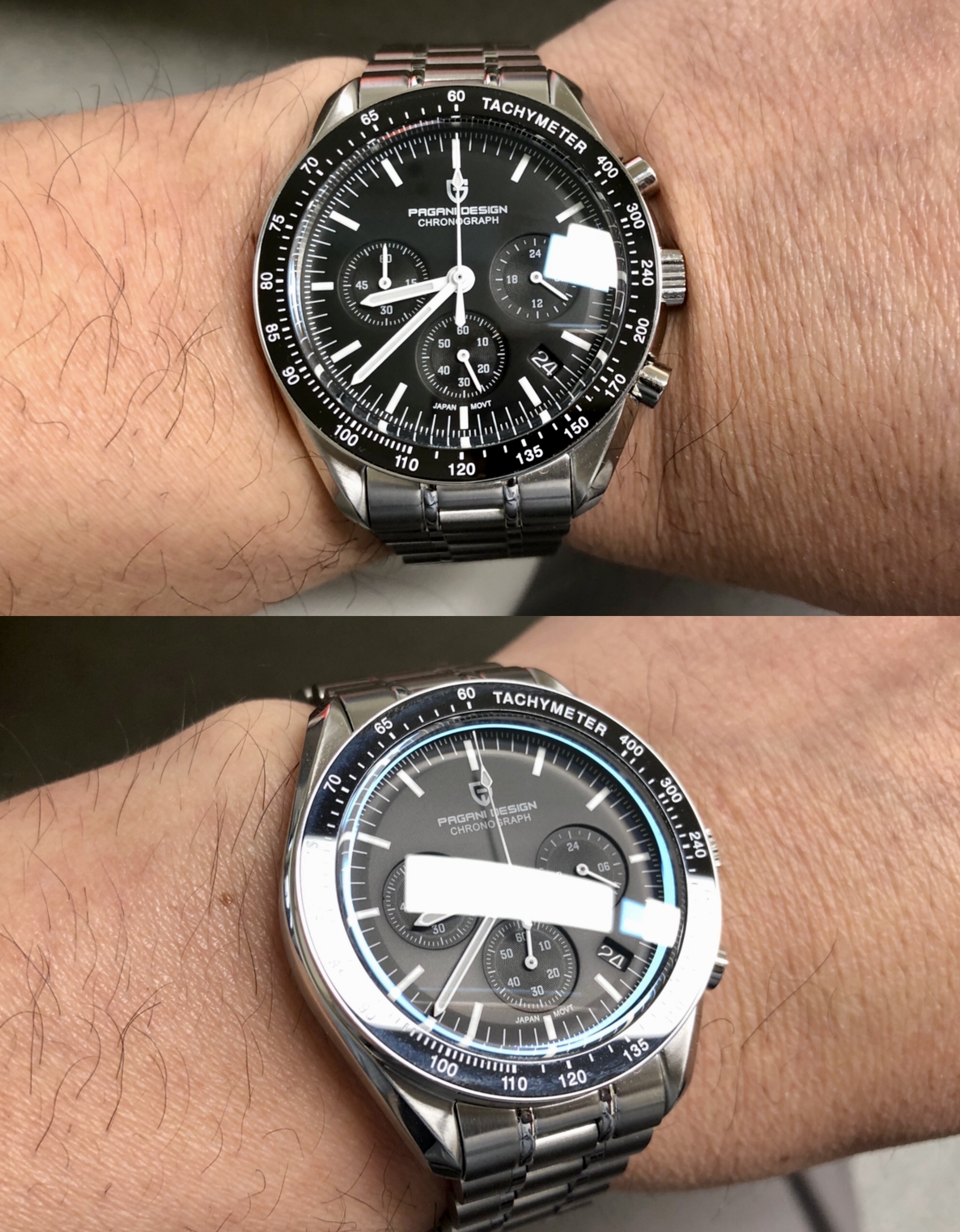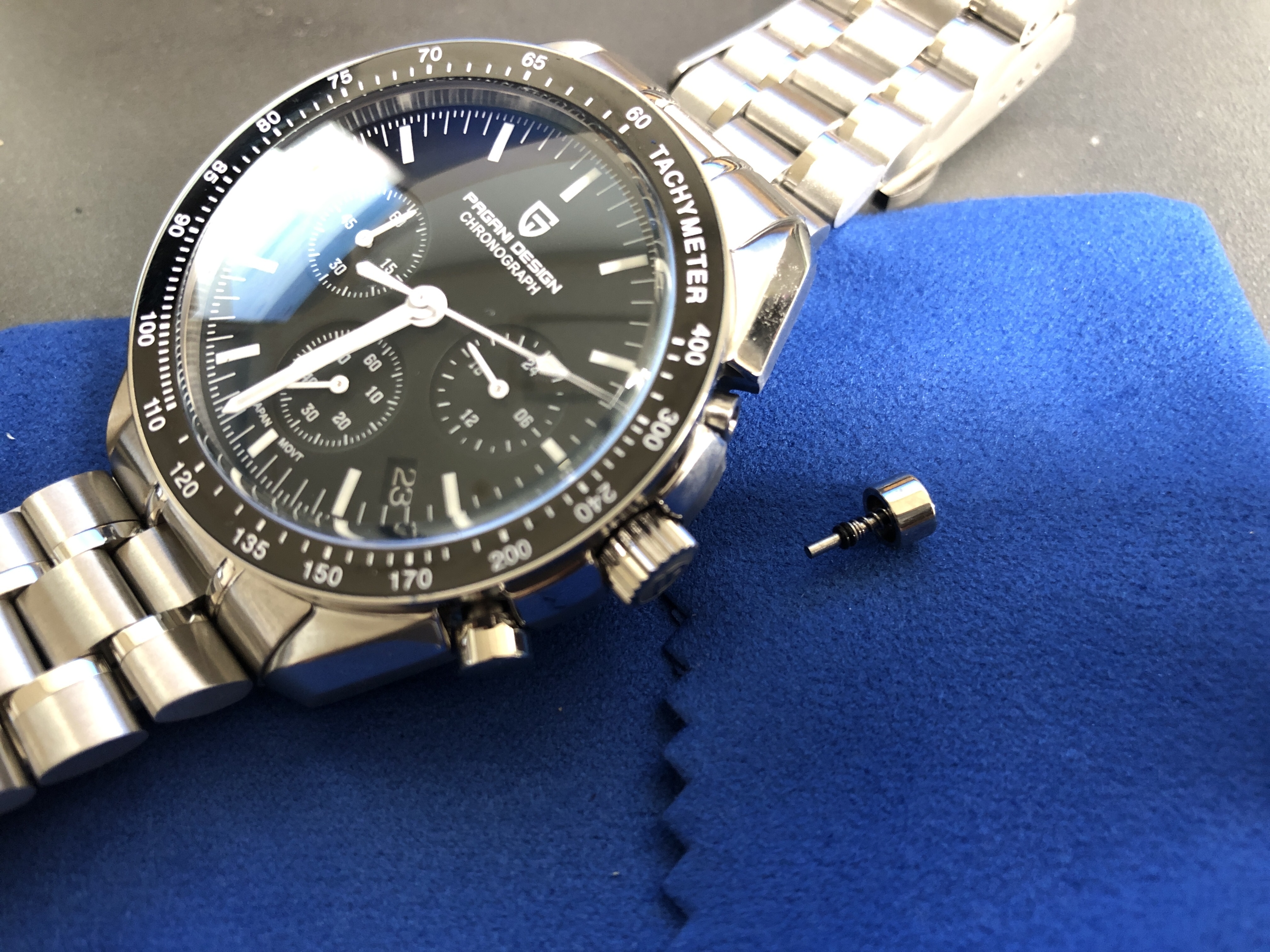 PD-1701은 오메가의 스피드마스터의 오마쥬 모델로 유명하기도 하고, 10만원대로 저렴하고 이쁘기도 해서 하나 구입했다. 4월8일 주문해서 23일 받음. 받자마자 보호필름 떼어내고, 손목에 맞게 줄도 좀 줄이고 하던 중..... 우측 버튼이 고정이 안되고 자꾸 빠지는 것을 발견, 알리 판매자에게 사진보내고 환불 요청.....ㅠㅠ.