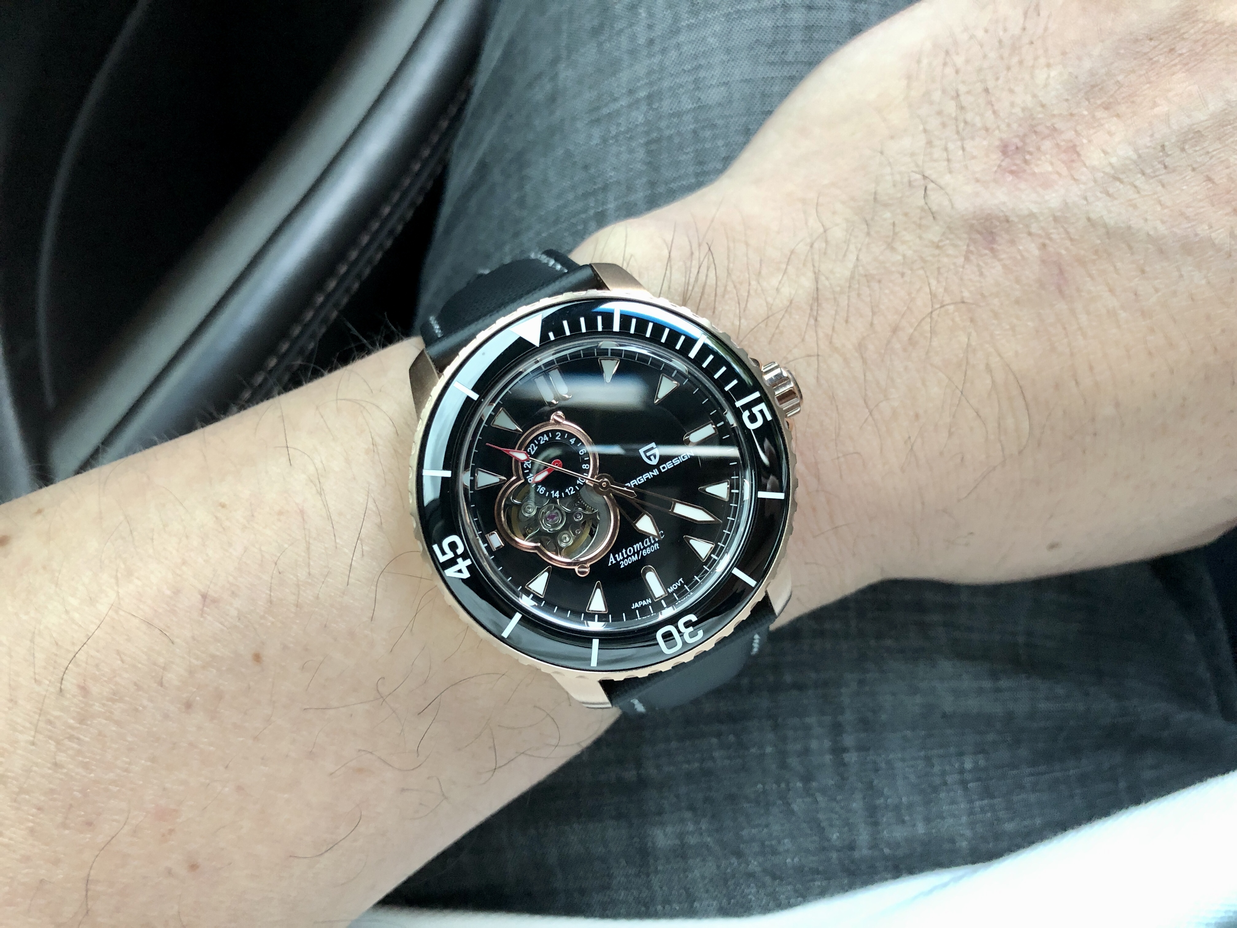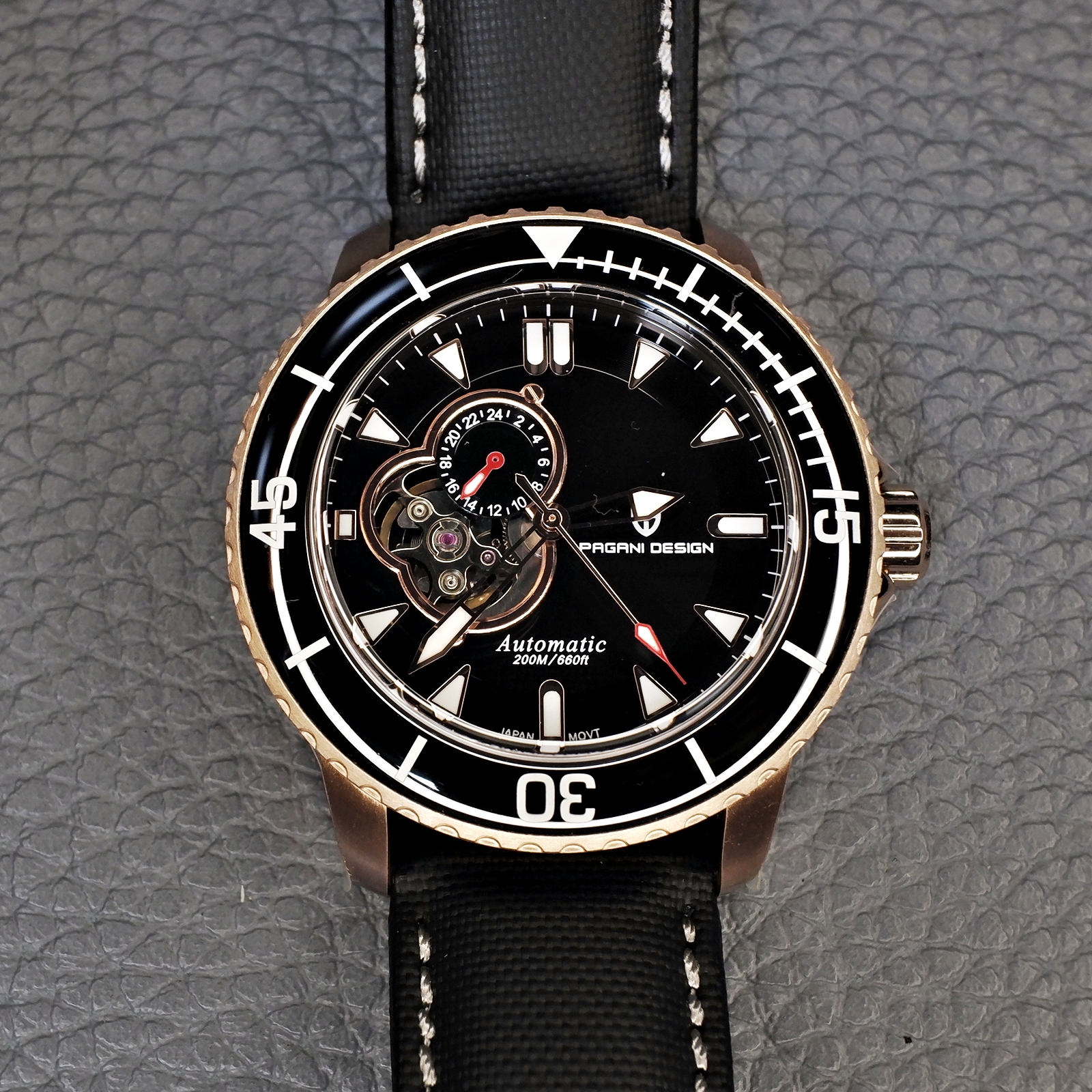 일본 NH39A 오토매틱 무브먼트를 사용한 신형모델. 두께가 좀 두꺼운데, 15mm. 다이얼 직경이 44mm. 밴드 폭 22mm. 수심 200m 방수에 야광도 준수하다. 밴드는 나일론 소재.