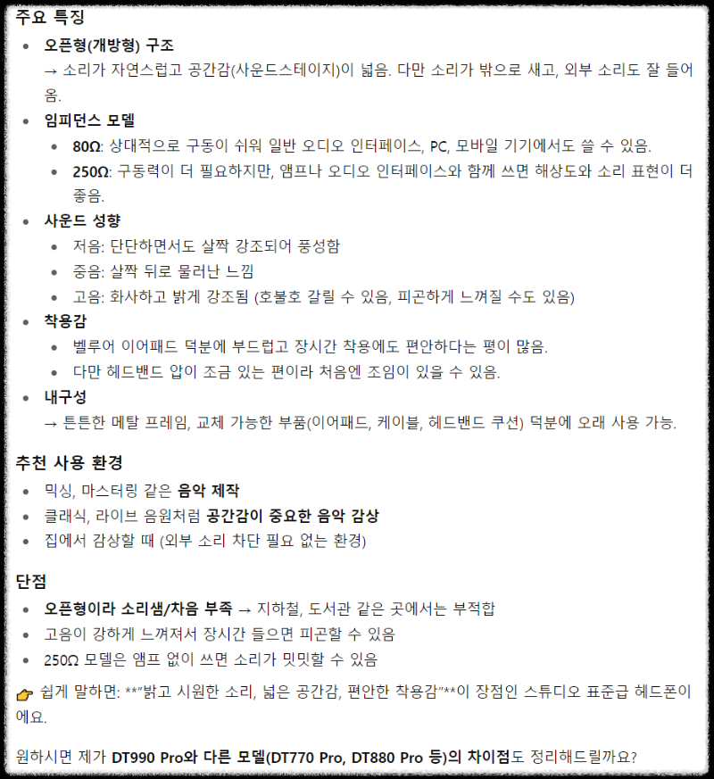 번개장터에서 아주 저렴하게 겟. 주파수 대역 5 - 35kHz / 임피던스가 250옴. 오픈형으로 밖의 소리도 다 들리고, 밖에서 헤드폰 음악소리도 다 들린다....ㅋ.