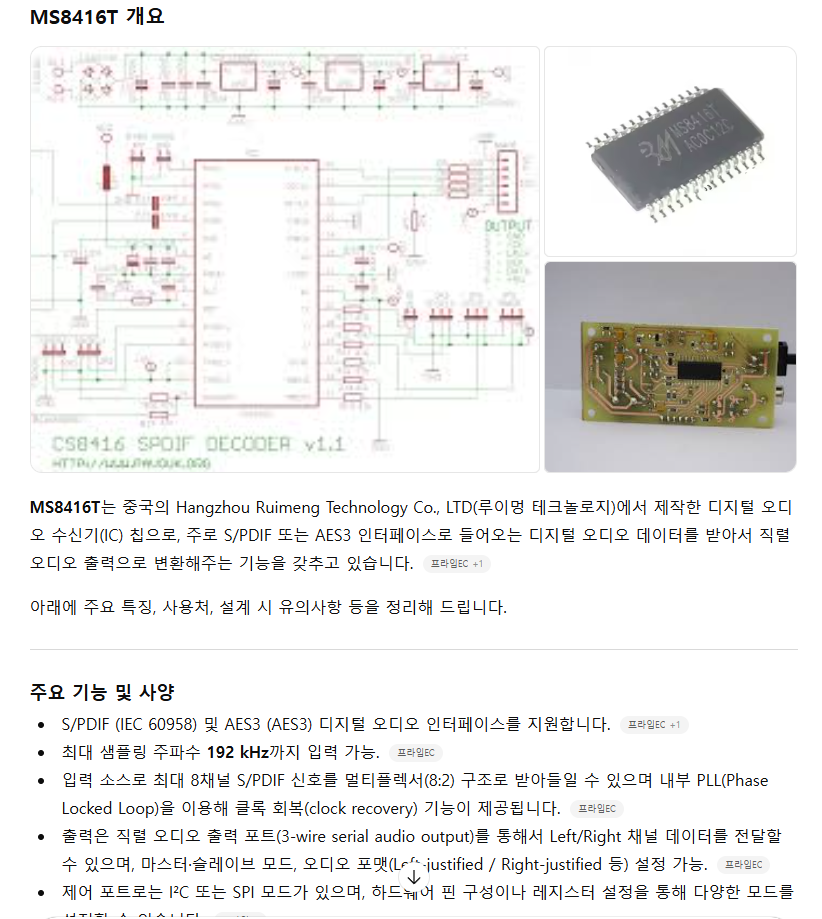 분해를 해봤다. 가운데 우측으로 MS8416T 라는 칩셋이 보이는데, 설명은 아래에. 중국산 제품이며, 실제 192kHz 까지의 입력을 받아준다네? 다른 칩셋도 찾아봤는데, 정보가 없다.....ㅠㅠ.