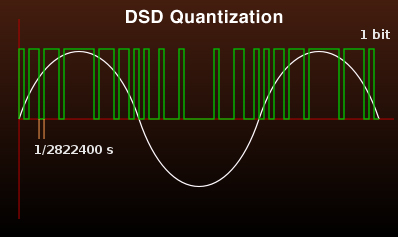 DSD는 펄스 밀도 변조(PDM) 방식을 사용하여 음악을 인코딩하는데, 이는 2.8224MHz의 샘플링 속도로 단일 비트 값을 순차적으로 저장하는 방식입니다. 이는 레드북 CD의 샘플링 속도인 44.1kHz보다 64배 빠르지만, 해상도는 16비트의 32,768분의 1에 불과합니다.