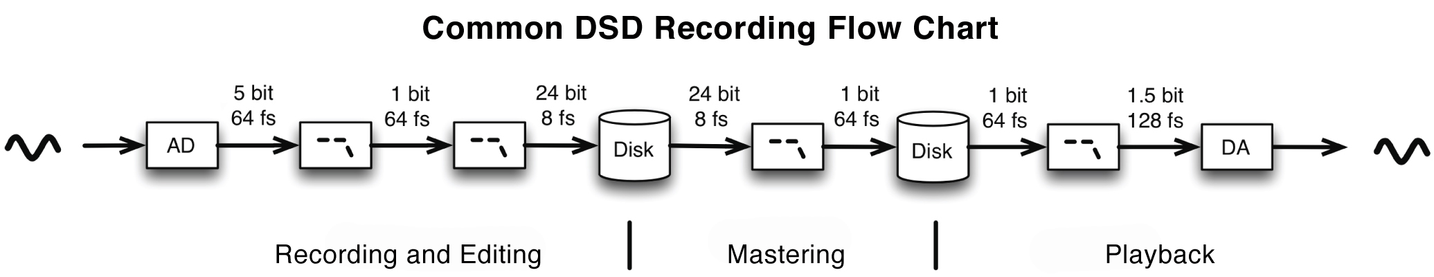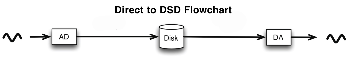 위의 흐름도에서 볼 수 있듯이, 시중에 판매되는 대부분의 DSD 녹음 파일은 후반 작업(편집, 믹싱, 마스터링)을 위해 PCM 형식으로 변환해야 합니다. 이러한 변환 과정에서 양자화 노이즈 및/또는 양자화 오류가 녹음 파일에 추가됩니다. 이러한 이유로 청취 가능한 해상도가 낮은 24비트 및 와이드 DSD 포맷이 매우 높은 샘플링 속도로 개발되었습니다. 편집, 믹싱, 마스터링 과정에서 해상도가 높을수록, 녹음 파일을 시중에서 판매되는 포맷으로 다운샘플링할 때 청취 가능한 주파수 대역의 디지털 노이즈가 줄어듭니다.