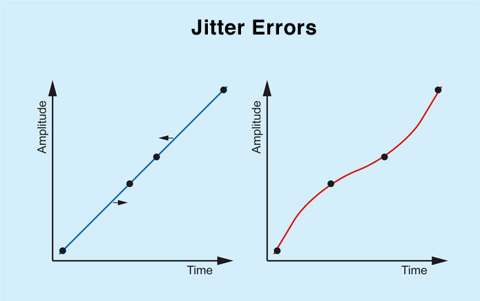 지터는 클럭킹의 부정확성으로 인해 발생하는 재생 주파수의 불일치를 의미합니다. 그 결과 음악의 박자와 음정이 왜곡되는 현상이 나타납니다. 주파수 불일치 패턴은 종종 비정상적인 홀수 고조파 주파수를 가진 아날로그 파형을 생성할 수 있으며, 이는 흔히 "디지털 피로 증후군"으로 알려진 청취 피로감을 유발합니다. 아래 두 그래프에서 가로축은 시간축의 불일치를, 세로축은 진폭축의 불일치를 나타냅니다.