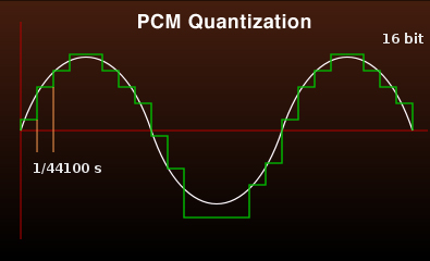 PCM은 아날로그 신호의 진폭을 일정한 간격(모눈종이와 유사)으로 샘플링하여 인코딩하며, 각 샘플은 디지털 스텝 범위 내에서 가장 가까운 값으로 양자화됩니다. 스텝 범위는 녹음의 비트 심도에 따라 결정됩니다. 16비트 녹음은 65,536 스텝, 20비트 녹음은 1,048,576 스텝, 24비트 녹음은 16,777,216 스텝을 가집니다.