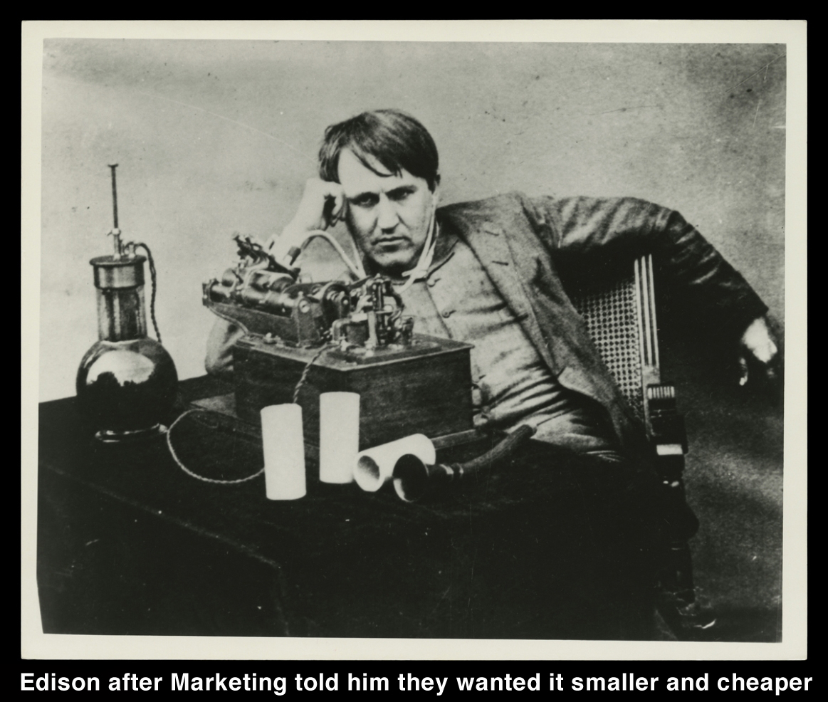 1877년 말, 토머스 에디슨은 크로스의 이론을 활용하여 실린더 축음기를 발명했고, 이로써 음악 애호가들은 처음으로 집에서 녹음된 음악을 감상할 수 있게 되었습니다. 현대적인 실린더 축음기를 상상해 보세요. 접선 트래킹 방식… 아크 오차 없음… 스케이팅 오차 없음(Tangential tracking…no arc error…no skating error). 완벽한 개념이었죠.