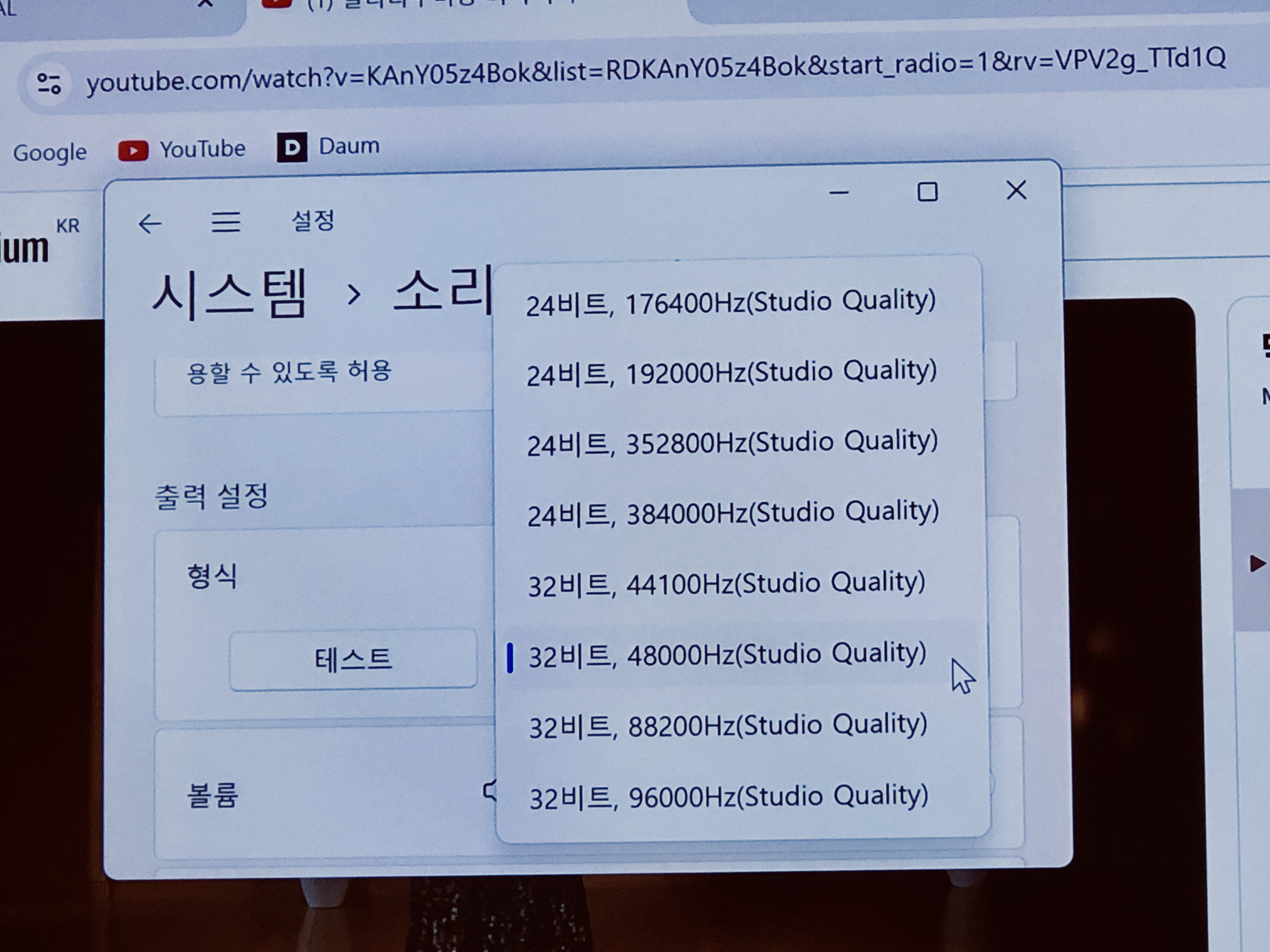 한마디로 오디오랩 옴니아가 사운드카드가 된 셈인데 알아서 저렇게 해상도를 잡아주네. 타이달도 좋고 유튜브 프리미엄 감상에도 좋다.