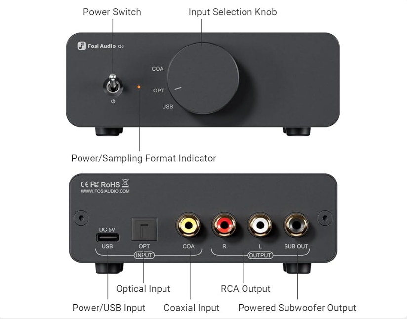 구매 포인트 : 외부 전원 필요없음. USB-C로 전원공급하면 되고, PC연결 및 광, 동축 연결 가능. 서브우퍼 아웃까지 있음.