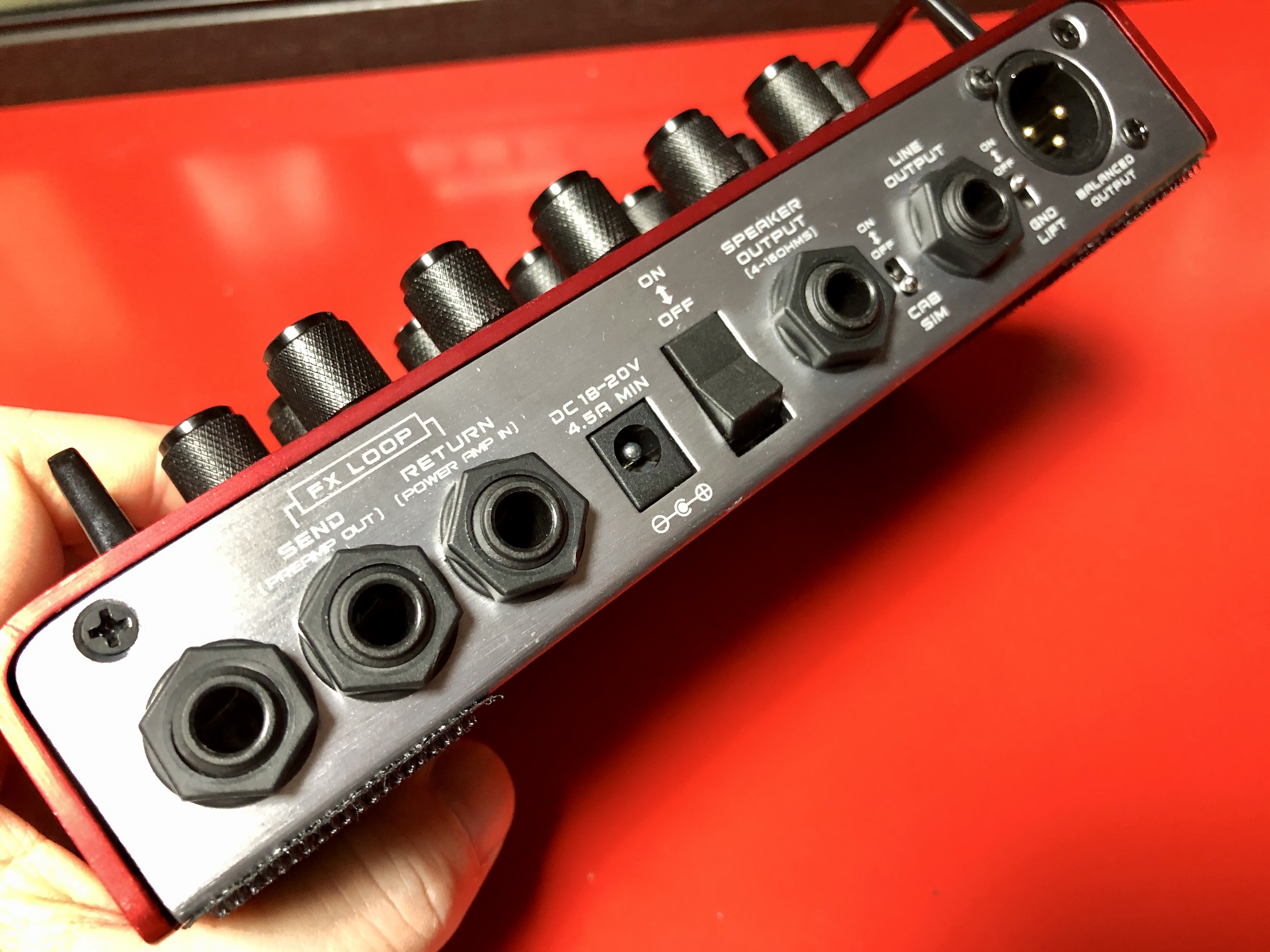 각종 노브들이 즐비. 센드리턴도 있고, 스피커 아웃에 라인아웃까지. 캐비넷 시뮬 스위치도 있음.